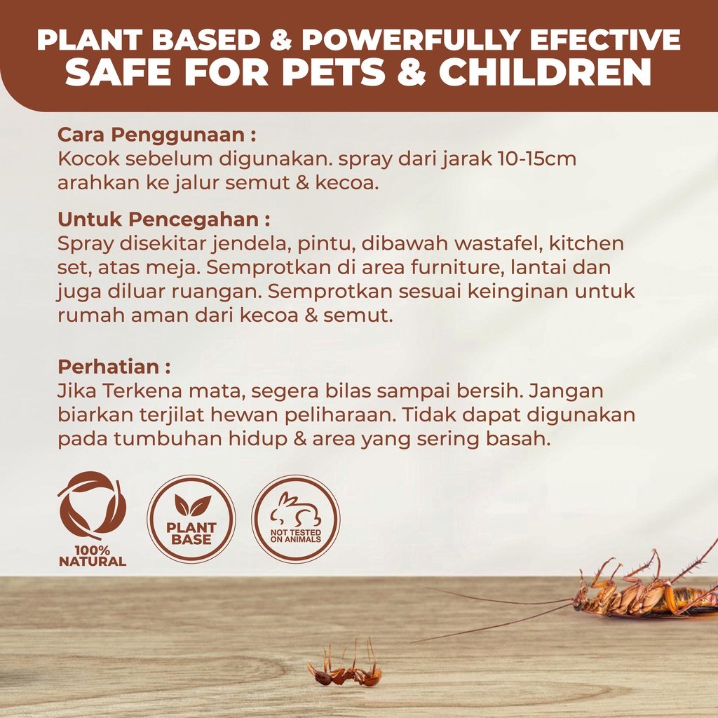 adalah semprotan serbaguna yang diformulasikan dengan bahan aktif alami dan aromatherapy, efektif untuk membasmi sekaligus mengusir kecoa, semut, dan berbagai serangga merayap lainnya. Aman digunakan di rumah karena tidak membahayakan anak-anak maupun hewan peliharaan.
